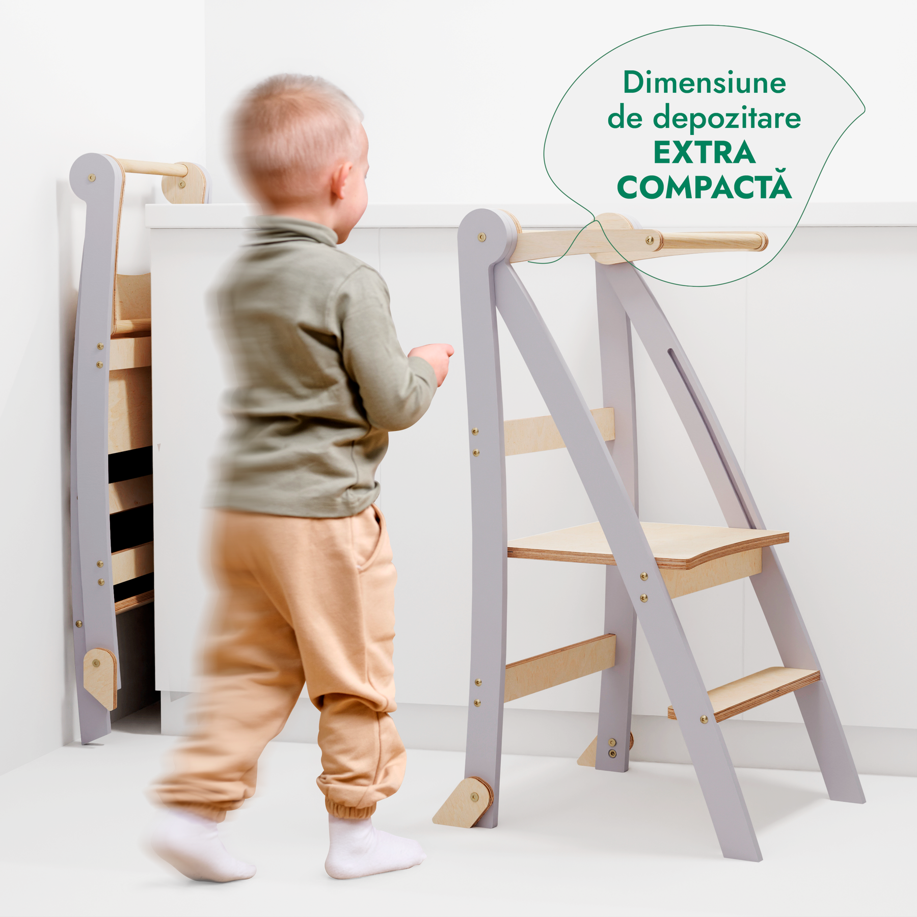 Lasă-ți micuțul să exploreze, să învețe și să crească cu încredere! De la amestecarea și frământarea aluatului, până la tăiere, feliere, turnare și chiar spălatul dinților sau al vaselor — activitățile zilnice devin distractive și educative cu sprijinul turnului nostru pliabil pentru copii mici.
