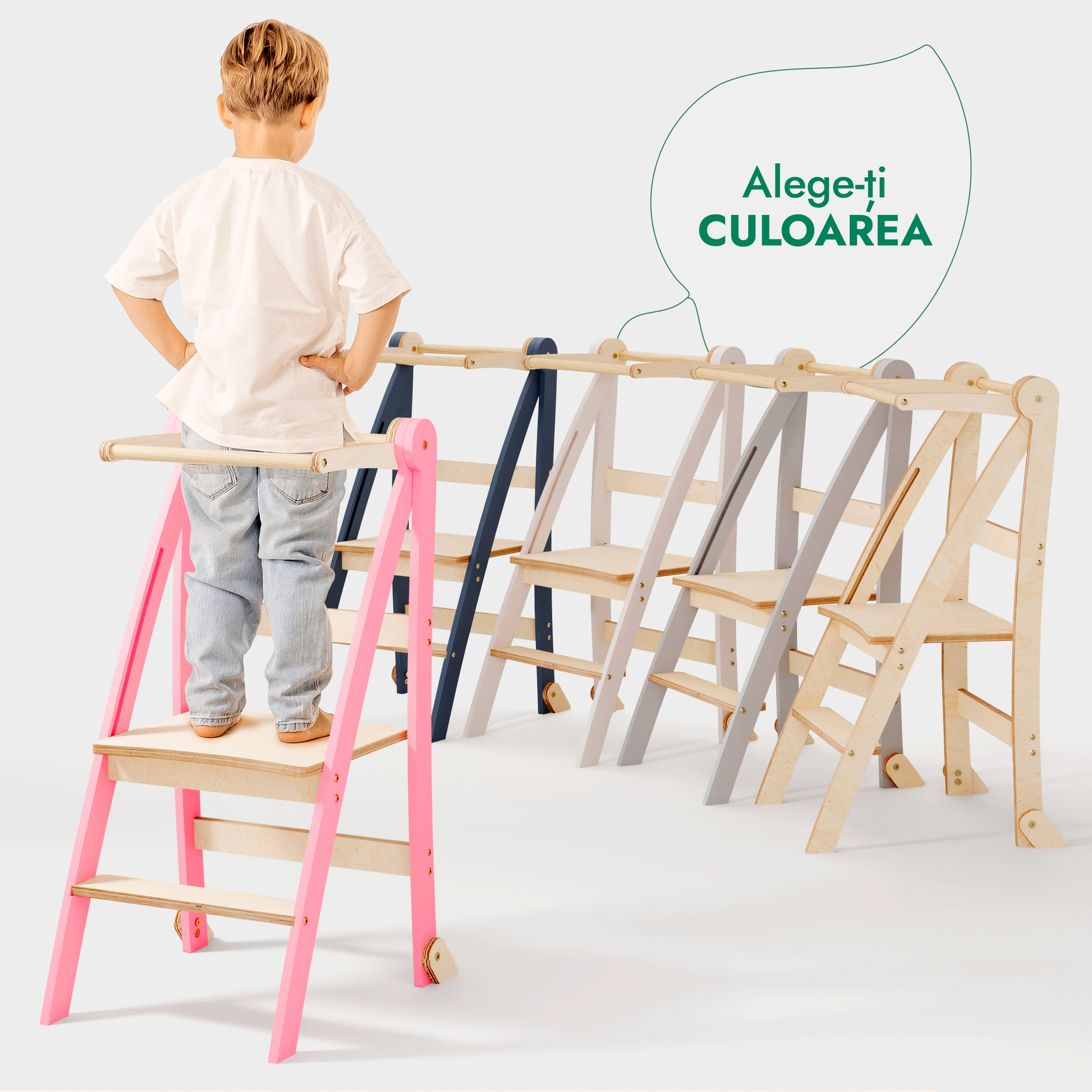 Lasă-ți micuțul să exploreze, să învețe și să crească cu încredere! De la amestecarea și frământarea aluatului, până la tăiere, feliere, turnare și chiar spălatul dinților sau al vaselor — activitățile zilnice devin distractive și educative cu sprijinul turnului nostru pliabil pentru copii mici.